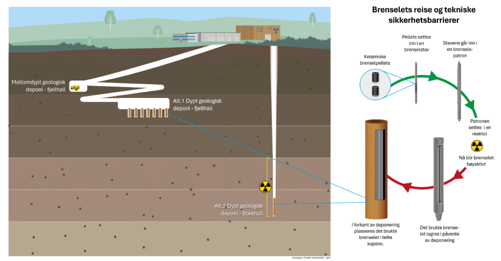 Det skal bygges en permanent løsning for alt atomavfall i Norge. Den mest aktuelle løsningen er å bygge et deponi – et lager dypt nede i fjellet – der avfallet kan ligge trygt i mange tusen år uten å skade mennesker eller miljø. Et deponi skal blant annet tåle istid og andre geologiske hendelser, samt alle mulige fremtidsscenarier. Det sier seg selv at det er krevende å finne egnet sted og ta tid å bygge.